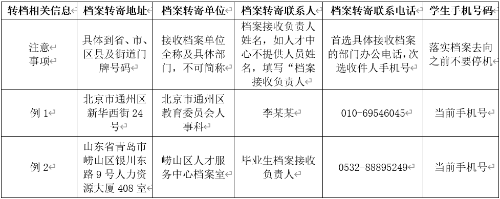 档案馆是依据招生就业处的毕业生派遣信息转递毕业生档案的,所有统考统招的双证毕业生都必须在学校就业指导中心系统中填写档案转递信息。通过邮政EMS转递档案,邮寄档案的信息必须包括五个方面,请同学们一定事先核实信息,准确填写,不可空白或者随意填写“无”或“不知道”。